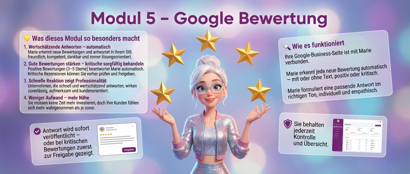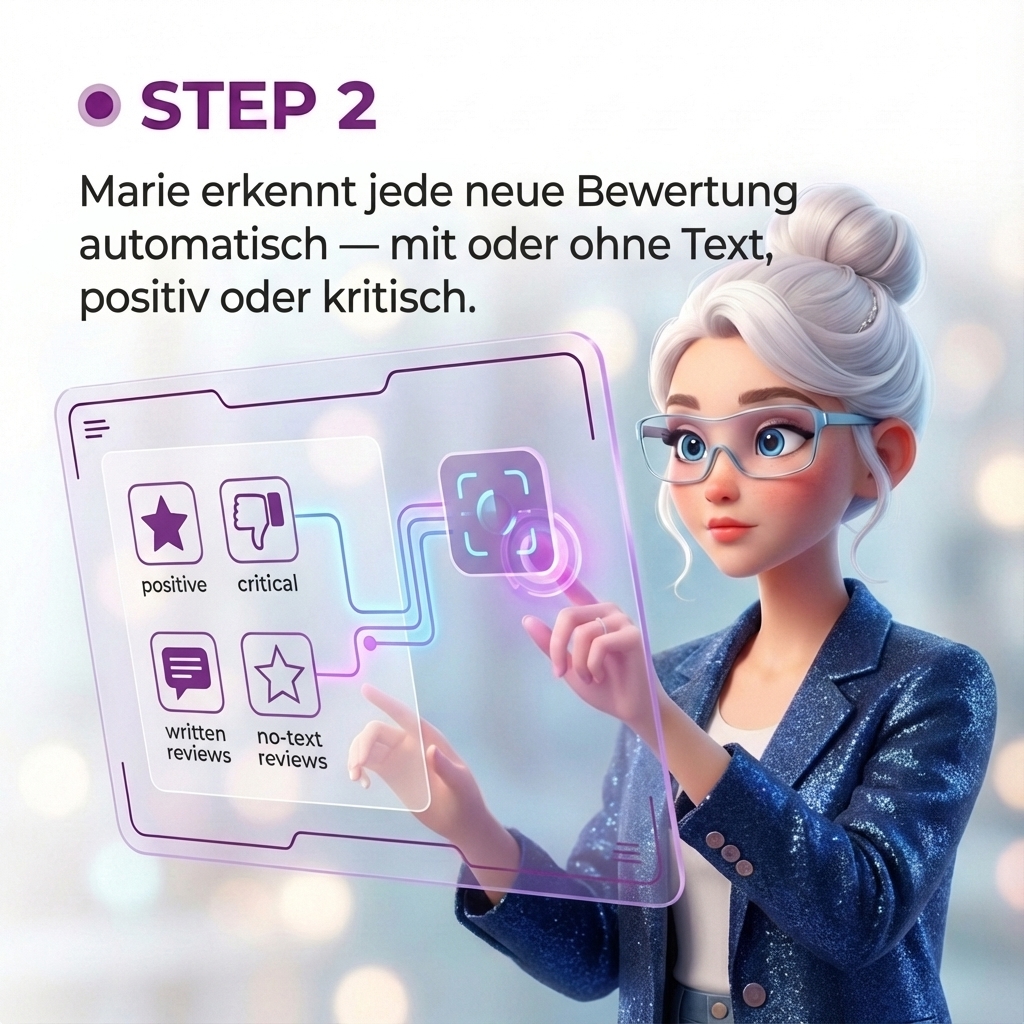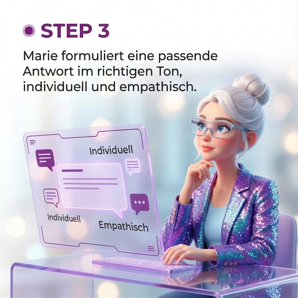 Marie erkennt neue Bewertungen und antwortet in Ihrem Stil: freundlich, kompetent, dankbar und immer lösungsorientiert.Gute Bewertungen stärken – kritische sorgfältig behandeln