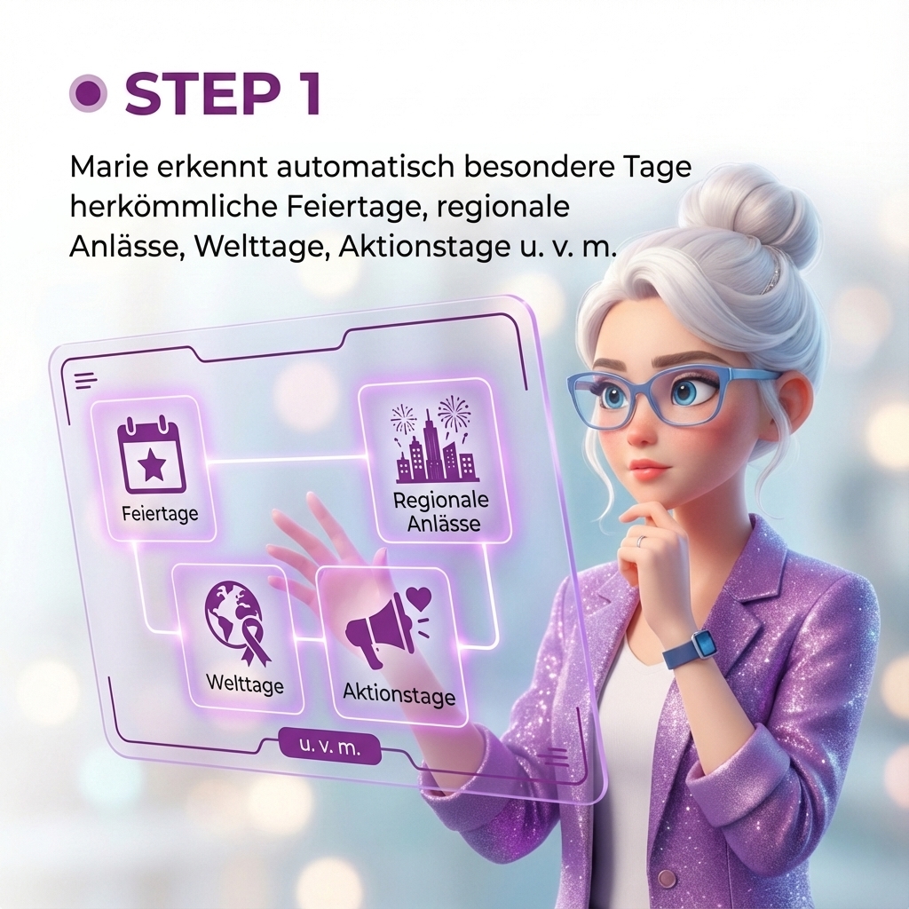 Marie kennt alle wichtigen Feiertage, regionalen Tage und über 100 besondere Anlässe (z. B. Weltfrauentag, Tag der Pflege, Halloween).