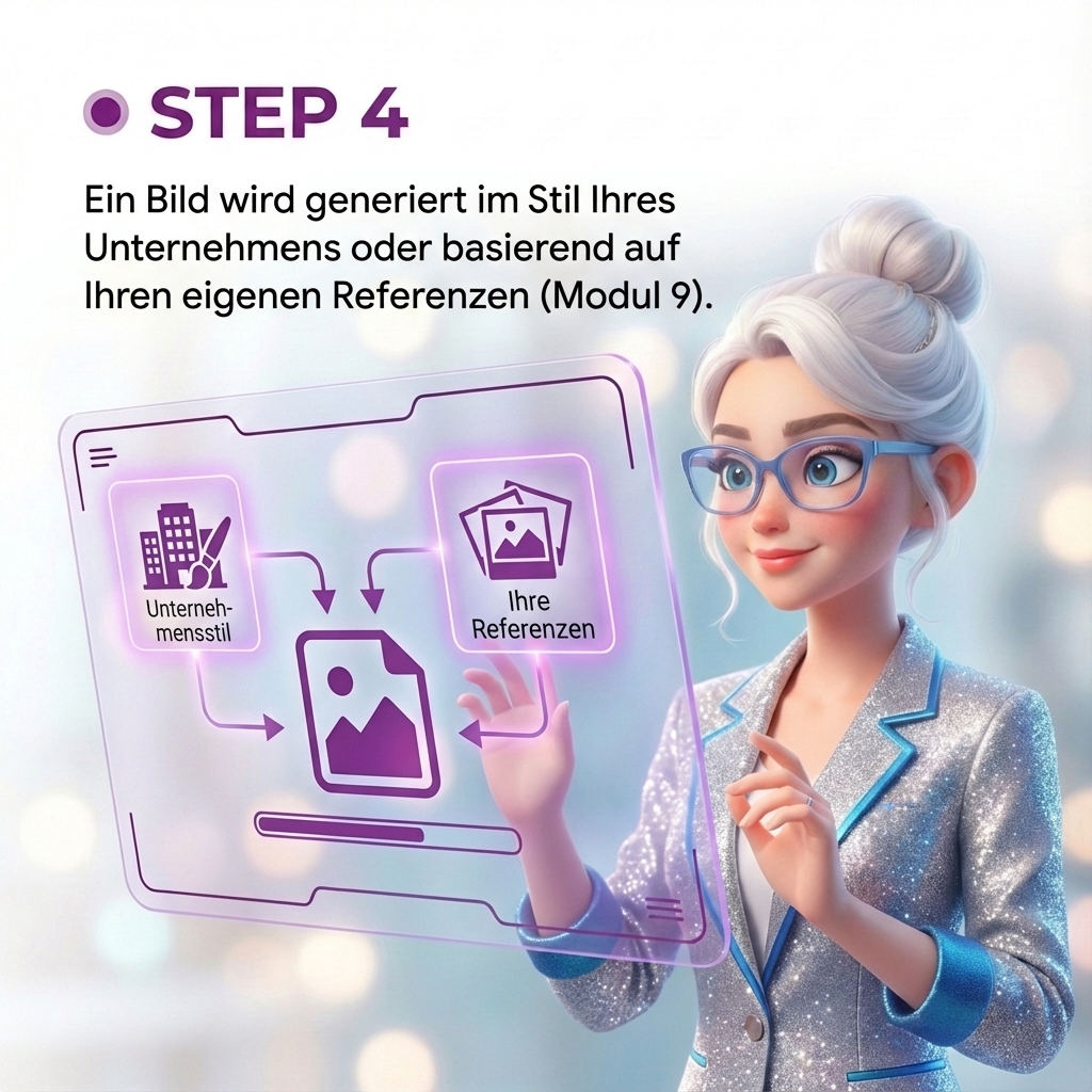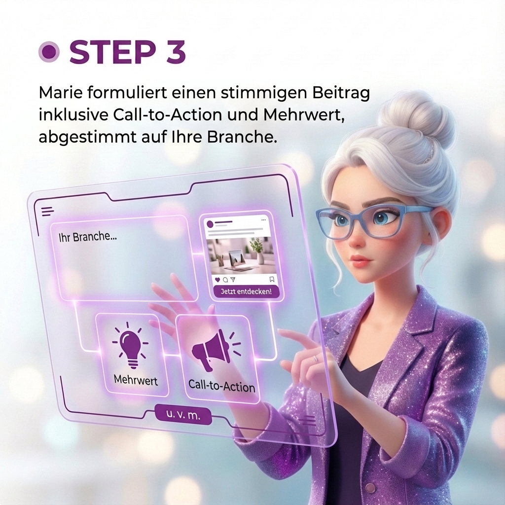 Für jeden Anlass erstellt Marie ein abgestimmtes Bild im Stil Ihres Unternehmens – emotional, freundlich, einzigartig. (Nutzt auf Wunsch auch Ihr Bildstil-Modul.)