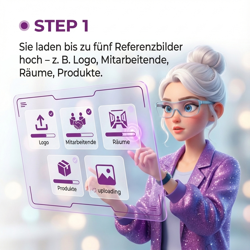 Mit „Bilder in Ihrem Stil“ erschafft Marie eine eigene visuelle Welt für Ihr Unternehmen. Sie laden einige Referenzbilder hoch – Ihre Räume, Ihr Team, Ihr Produkt, Ihr Logo – und Marie versteht: So sieht es bei Ihnen aus. So soll es aussehen.