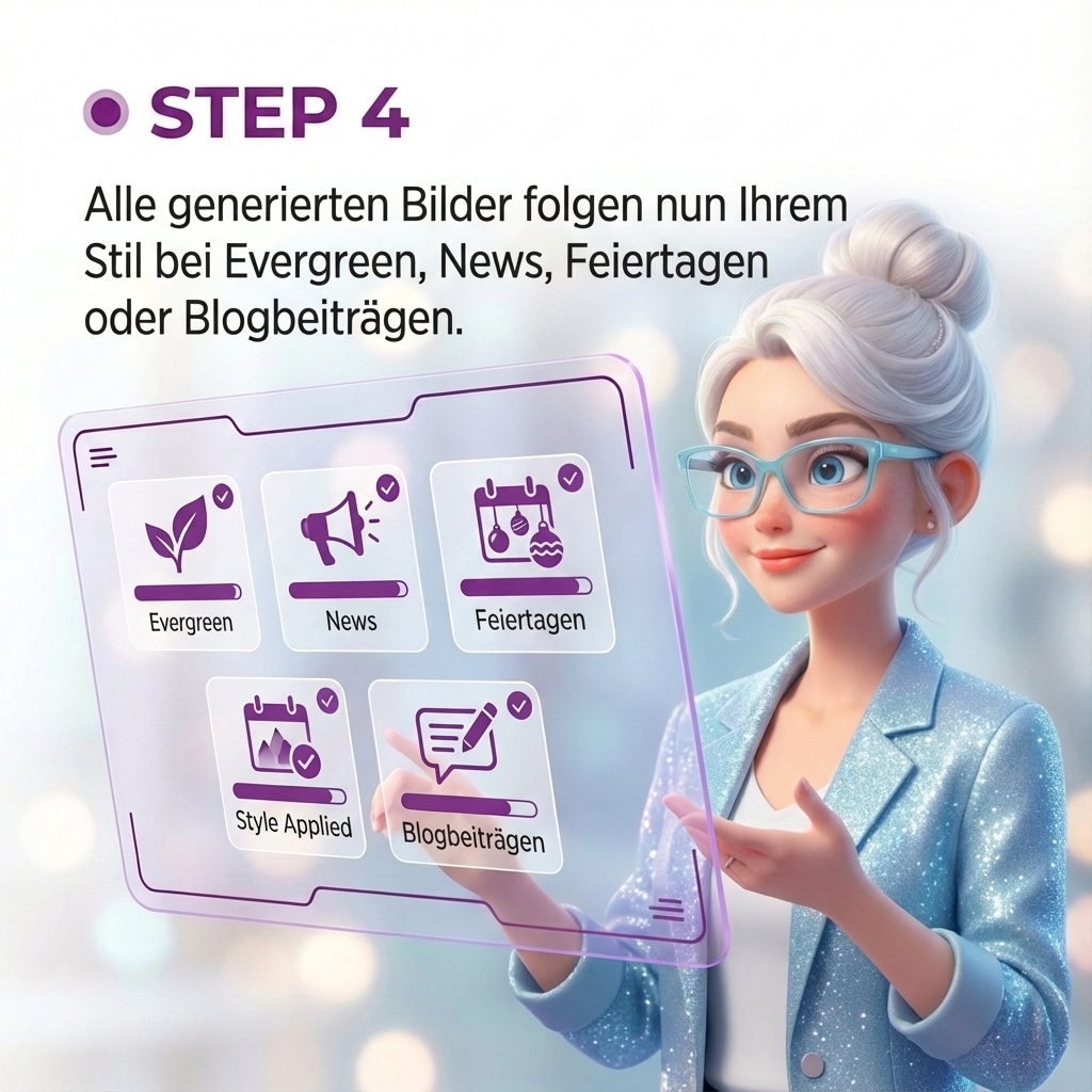 Fortan gestaltet Marie jedes generierte Bild im Stil Ihres Unternehmens, sodass Ihre Marke überall wiedererkennbar bleibt – warm, authentisch, einzigartig.